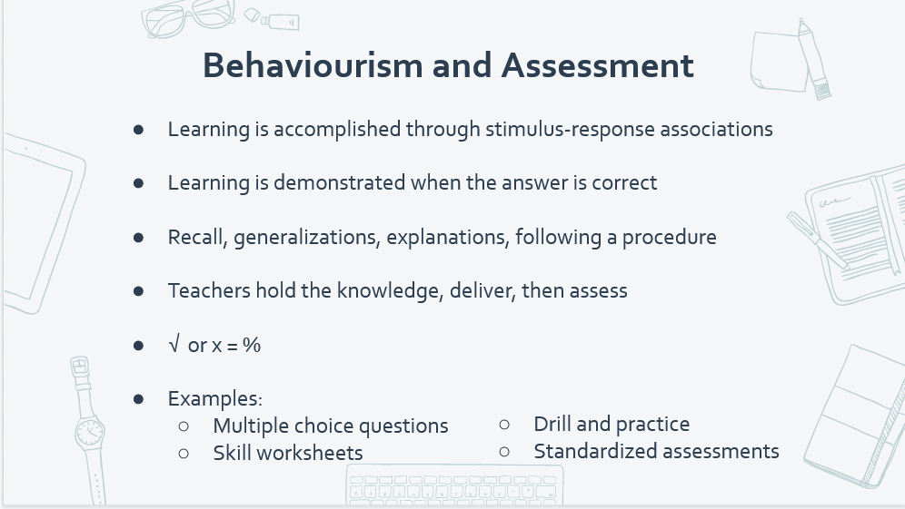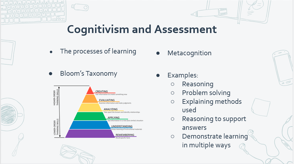 The biggest take-away for me from this topic was the alignment of the learning theories to assessment. Prior to this class it is not something I thought about or had even considered. I think this might have been a missing piece for me about assessment. It is so clear to see that not only do you need to consider assessment for/as/of learning but also how your assessment practices align with your instructional practices and your beliefs about learning.